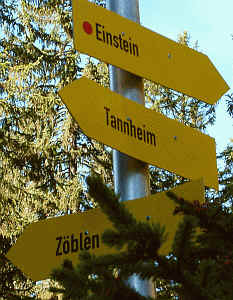 Der Einstein aus der Sicht von Tannheim. Ganz links im Bild der "Zugspitzblick", vor uns die Ortschaft Berg (Tannheim)Als Ausgangspunkt dieser Bergbesteigung haben wir uns den Zugspitzblick bei Zöblen ausgewählt (Ortsteil Halde). Man erreicht ihn über eine kleine Straße, einem Pass sehr ähnlich. Von dort wandert man sehr schön über einen Sattel ca. 3,8 km weit bis zum Einstieg in den Einstein. Sicherlich ist die direkte Route von Tannheim/Berg (1100 m) aus die kürzere, aber vom Zugspitzblick aus hat man den exponierten Berg so schön im Blick.