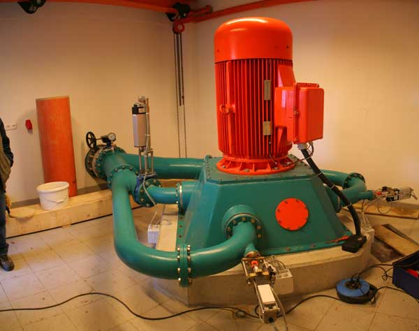 Durch Zufall konnte ich später, als Arbeiter eine Wartung vornahmen, einen Blick in das 2005 erbaute Wasserkraftwerk werfen. Die Peltonturbine mit 140 KW installierter Leistung war überraschend klein. Die Zuleitung vom Wasserfall ist ein Kunststoffrohr! Bis zur Turbine. Erst dort wo die Regler installiert sind, kommt Gußeisen zum Einsatz. Links ein Schaufelrad, gerde mal Handteller gross.