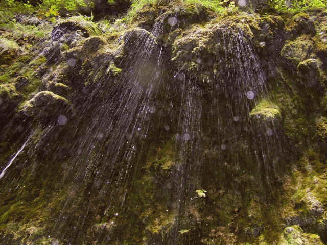 Links vom Wasserfall moosbewachsene Sinterablagerungen wie beim Schleierfall der Ammer oder dem Schleierfall vom Rehbach.