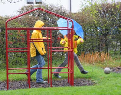 Unter dem Dach ist viel Platz, den Kindern macht der Regen nichts aus.