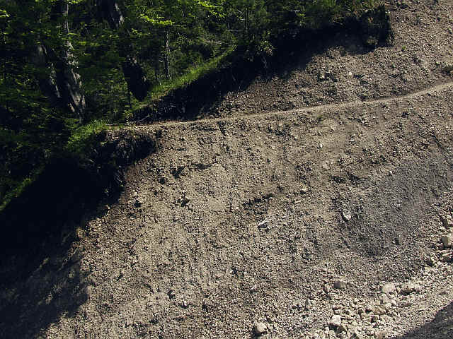 Und wieder eine Erosionsrinne, an dessen Ende zwischen Buchenstämmen eingekeilt Pickel und Schaufel. Diese werden sicherlich nach so manchem Gewitter den Abstieg ermöglicht haben.
