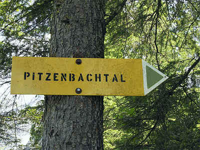 Noch vor dem Pitzenbach weist das gelbe Schild rechts hinauf in den Bergwald.