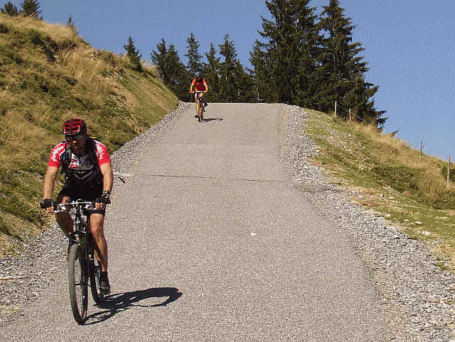 Rückblick auf den mittleren Gipfel. Zahlreiche Pfade führen hier an den Hängen hinunter. Um den Hörnle See herum ist ein breiter Sumpfgürtel, so dass wir nicht an sein Ufer heran kommen konnten. Wir steigen den gleichen Weg wieder zur Buchel-Alpe hinunter. Hin und wieder begegnen uns mutige Mountainbiker und wir wundern uns, dass diese auf der steilen, kiesbedeckten Fahrbahn keine Schwierigkeiten mit dem Bremsen haben.