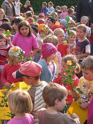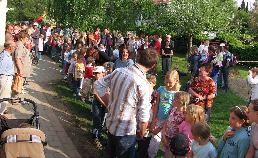 Die Segnung mit dem Herrn Pfarrer Schmid ist der Schluss der Zeremonie. Die Kinder nehmen das neue Spielgerät in Ihren Besitz. |