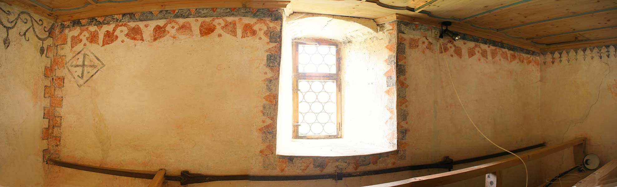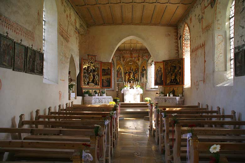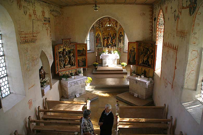 ![]() Am eigenartigsten ist der linke Seitenaltar gearbeitet. Er zeigt die hl. Anna, St. Stephanus und St. Rochus. Interessant sind die Darstellungen auf den Flügeln. Im rechten Altar stehen die Heiligen Wendelin, Margarete und Vitus. Recht interessant ist auch die ornamentale Freskomalerei mit Wappen, Jagdszenen, Sonnenkreuzen und Drudenfüßen, vorchristliche Kultzeichen und Symbole darstellend. |