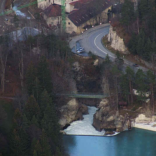 | Aus der Höhe des Dreiländereck ergeben sich ungeahnte Möglichkeiten, z.B. den Lechfall von oben zu fotografieren, als ob man darüber flöge. |