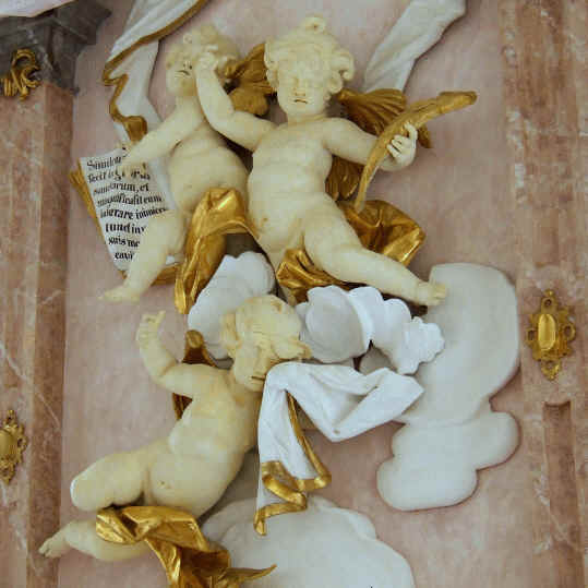 | Der Hauptaltar ist dem Hl. Ulrich geweiht. Die Engel beweinen den Tod des Bischof, zu dessen Insignien Buch, Bischofsstab, Mitra und Fisch (Zeichen für Christus) gehören. |