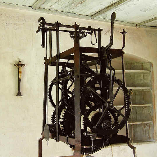 | Über der Kirche kann man die Wohnräume besichtigen, in denen früher die Geistlichen wohnten. Besonders interessant das alte Uhrwerk. | |