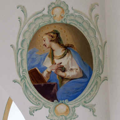 | Das Deckengemälde zeigt den großen Fischfang; Jesus gebot, noch einmal hinaus zu fahren um die Netze aus zu werfen. Petrus zieht das Netz an Land. An der südlichen Langhauswand ein Fresko mit der hl. Afra im Barockgewand. Sie schwebt auf einer Wolke sitzend auf einem Baumstamm, während von hinten sich eine Feuerwand nähert. Ein Engel reicht ihr einen Palmzweig, das Symbol für den Märtyrertod. Gegenüber der Hl. Ulrich. | |