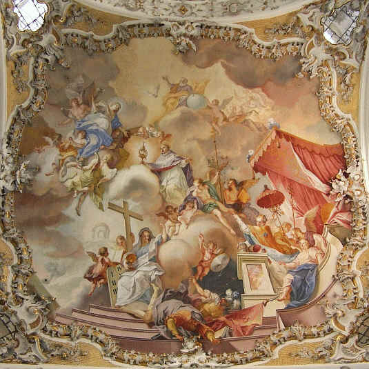 | Der Himmel in der Wies, zu ihm blicken wir auf, hier ist Erde und Himmel glorreich dargestellt. Hier kann man Zeit und Raum vergessen und sich ansprechen lassen. Nach dem wir uns satt gesehen hatten, wanderten wir fröhlich nach Hause. | |