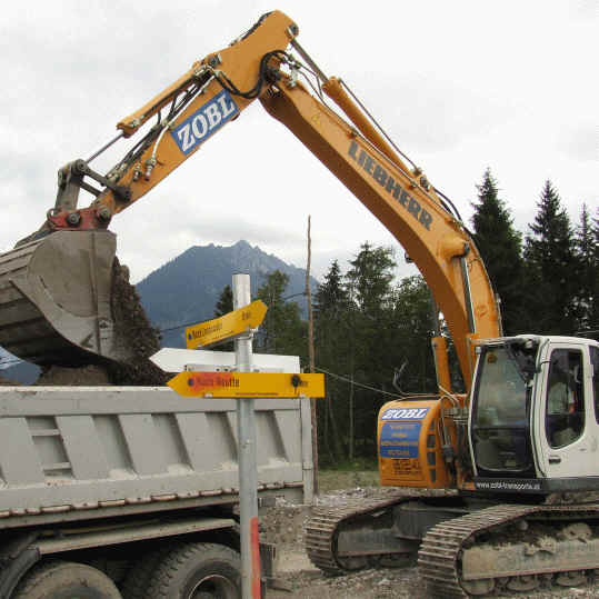 Nun wird der Weg allmählich breiter bis wir auf einen "Wendeplatz" ankommen, der gar nichts romantisches mehr an sich hat. Das Schild "Nach Lechaschau" weist auf die großen Pfützen und wir wenden uns dort wieder in Richtung Süden. Sicherlich sieht die Straße im nächsten Jahr wieder gepflegt aus, denn heute wurde dort um die Wette gebaggert. |