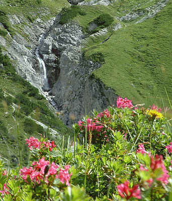 Alpenrosen, Wasserfälle, Berggipfel, wohin das Auge sich wendet.