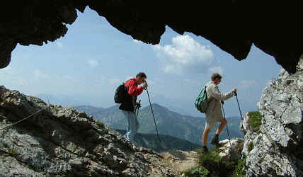 Eigenartig sind die blank geschliffenen Steinplatten. Mit der Sicherung durch das Stahlseil ist die Stelle jedoch problemlos zu schaffen. Die Wanderer im Fensterl (4) sind hier von unten fotografiert.