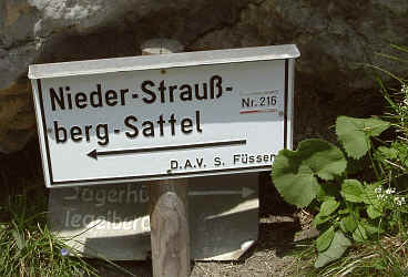 Auf dem Nieder-Straußberg-Sattel (7). Hier könnte man zur Tegelbergbahn hinauf wandern. Letzte Abfahrt 17.30 h. Eine Beschreibung des Weges von der Tegelbergbahn zum Berggasthof Bleckenau finden Sie unter Große Bleckenau-Runde der Tegelbergbahn
