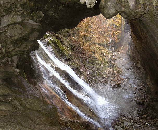 Oberhalb der beiden frischen Baumstümpfe verläuft der Weg und führt dann den kaum zu erkennenden Forstweg weiter. Flussaufwärts schlagen wir uns ca. 500m durch die Flussniederung an der Vils entlang. Die "Schleierfälle" mit der Grotte und dem ca. 7m hohen schrägen Wasserfall sind nicht zu verfehlen.
