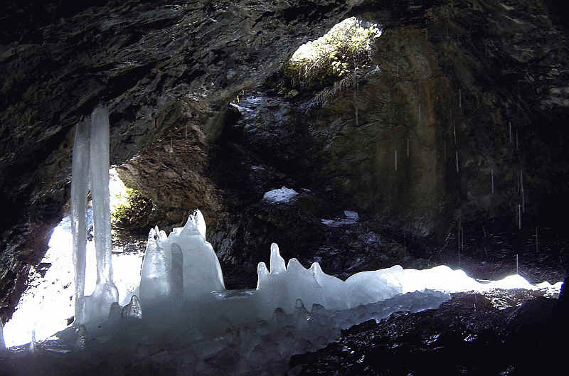 Leider befand sich das Eis schon wieder auf dem Rückzug. Wie schön mag erst die Halle nach 14 Tagen knackigem Frost aussehen? Aber vielleicht kann man sie dann vor Lauter Eiszapfen gar nicht mehr betreten, denn aus unzähligen feinen Löchern tropfte es unablässig von der Decke und den Wänden.