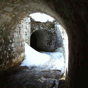 Der Weg in südlicher Richtung führt geheimnisvoll durch ein Tunnelgewölbe. Hier konnten unterirdisch Fuhrwerke wenden.