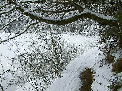 Leider war der weitere Winterzugweg nicht gespurt und ich musste hinunter zum See wandern. Dort entspringt eine Quelle, wie aus einem Bilderbuch. Beim nächsten Schild machte mich der "Israelit" neugierig und ich stapfte kurzerhand durch den Schnee den kaum noch erkennbaren Weg hinauf.